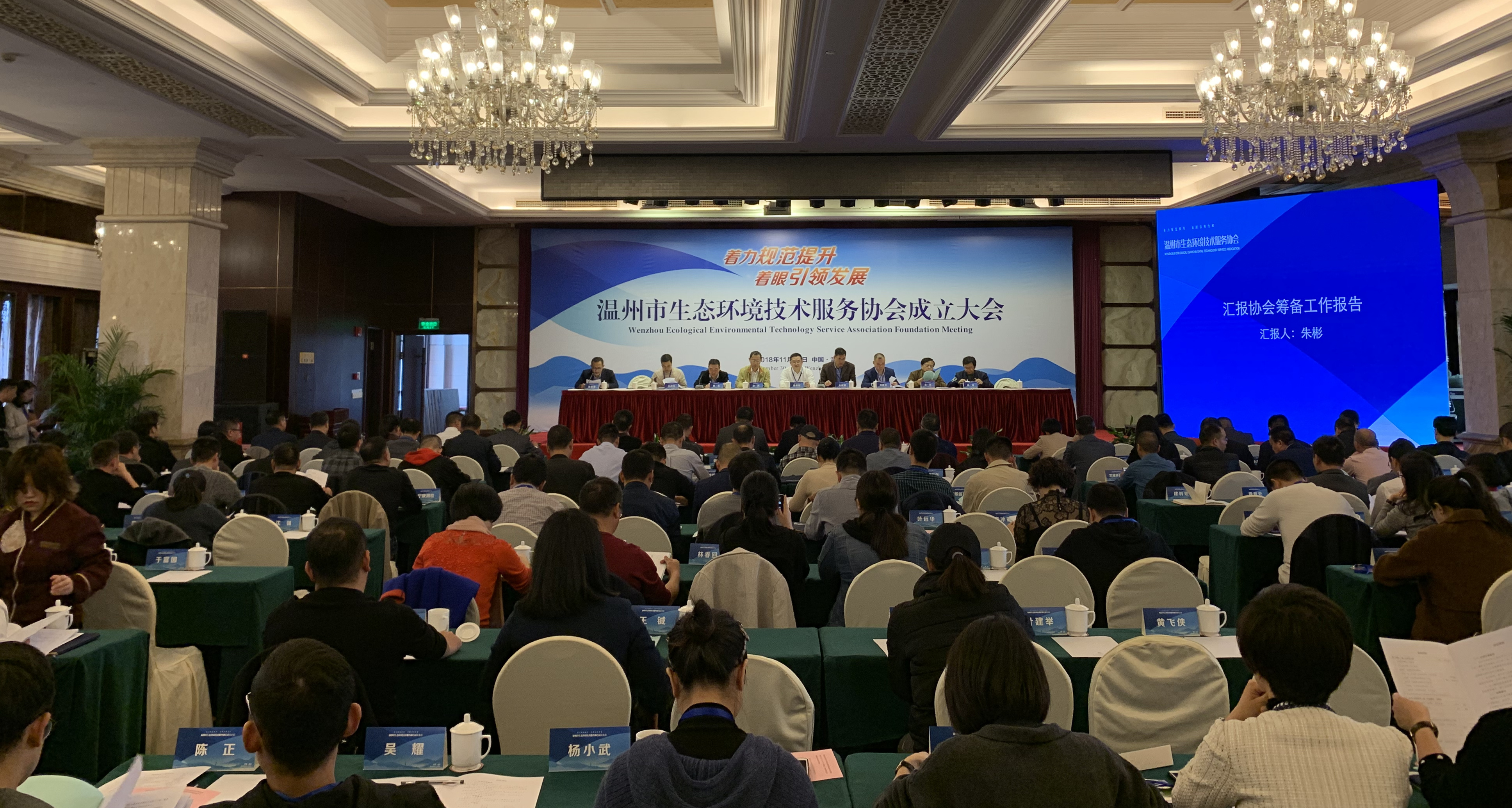 11月30日下午,溫州市生態環境技術服務協會成立暨第一屆一次會員大會在溫州奧林匹克大酒店召開。省生態環境廳科技與合作處、省生態環境廳環境監測與信息處、省環境檢測協會、省環境影響評價與環境監理行業協會、省固體廢物利用處置行業協會相關領導,市環保局潘黃星局長、劉建農調研員、蔡克主任,市民政局、市環境科學學會、市環保產業協會、以及各縣市區環保局等單位相關領導和嘉賓出席大會。會上,主要介紹了協會的籌備工作,審議并通過了協會章程,選舉產生了第一屆理事會和監事會,我公司當選協會第一屆會長單位。